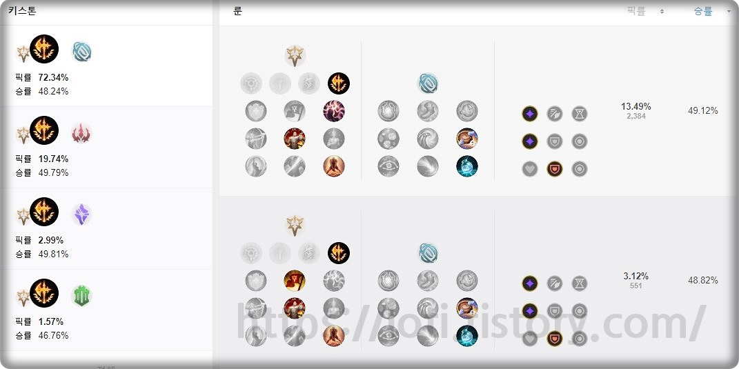 전라인 정복자를 고정으로 사용하고, 침착, 강인함, 최후의 저항 역시 고정적으로 사용을 합니다. 영감에서는 비스킷 배달, 시간 왜곡 물약을 사용하고, 캐리력을 높이는 지배에서는 굶주린 사냥꾼과 피의 맛을 사용을 합니다. 개인적으로 지배룬을 추천을 드립니다.