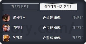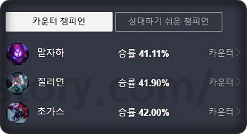 궁극기를 뺏어오는 특성과 들어가는 스킬 위주의 챔피언이라 상성이 상당히 복잡한 챔피언입니다. 또 성장 능력치가 좋아서 후반만 가면 뒤집는 경우도 많기 때문에 무조건 불리한 상성이라고 할 수 없습니다. 다만 통계상 침묵이나, 제압, 속박 등으로 움직임이나 스킬을 제한하는 챔피언에게 약하고, CC가 빈약할수록 강한 모습을 보여줍니다.