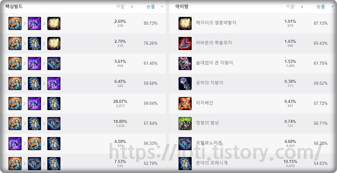 라이너는 보통 비슷한테 초기형 벨트, 루덴의 메아리, 모렐로노미콘, 존야의 모래시계, 라바돈의 죽음모자 순서로 템트리를 올립니다. 그 외에 잘 맞는 아이템으로 정령의 형상, 공허의 지팡이 등이 무난한데 후반에 탱킹력이 필요하다면 정령의 형상을, 적의 마법 저항력이 높다면 공허의 지팡이를 가주는 것이 좋습니다.