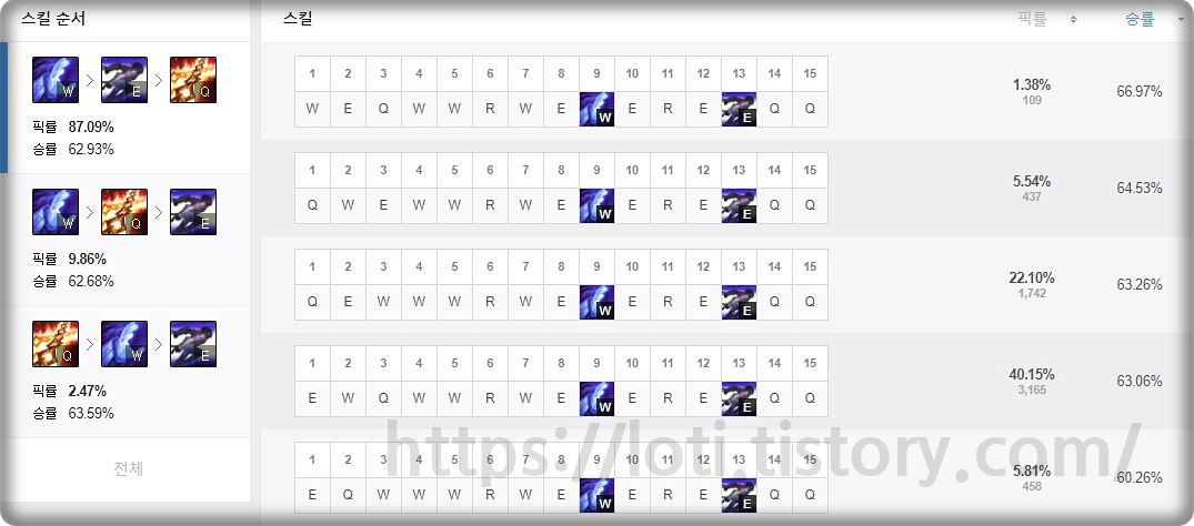 WEQ를 많이 선택을 합니다. W는 사실상 지금 사일러스의 주력기라 전라인이 가장 먼저 선마를 하며, 이후 Q와 E로 갈리는데 Q가 은근히 하자가 많아서 1타~2타 합치면 딜이 400인데 1타만 맞으면 120으로 엄청나게 줄어들고, 맞추기도 어려우며, 몬스터 및 미니언에게는 40%밖에 딜이 안 들어가서 다 맞춰봐야 160밖에 딜이 안 들어가는 하자 스킬이라 보통 WEQ를 많이 선택을 합니다.