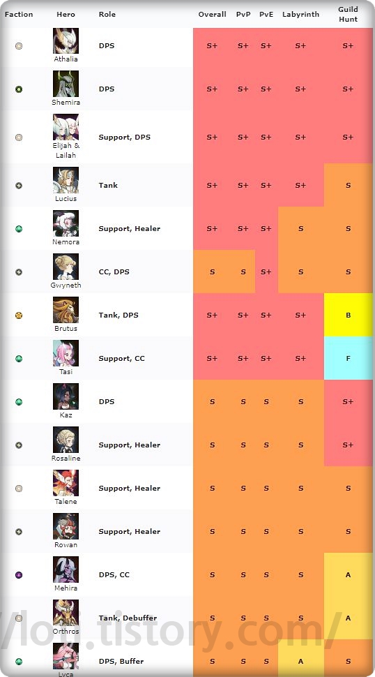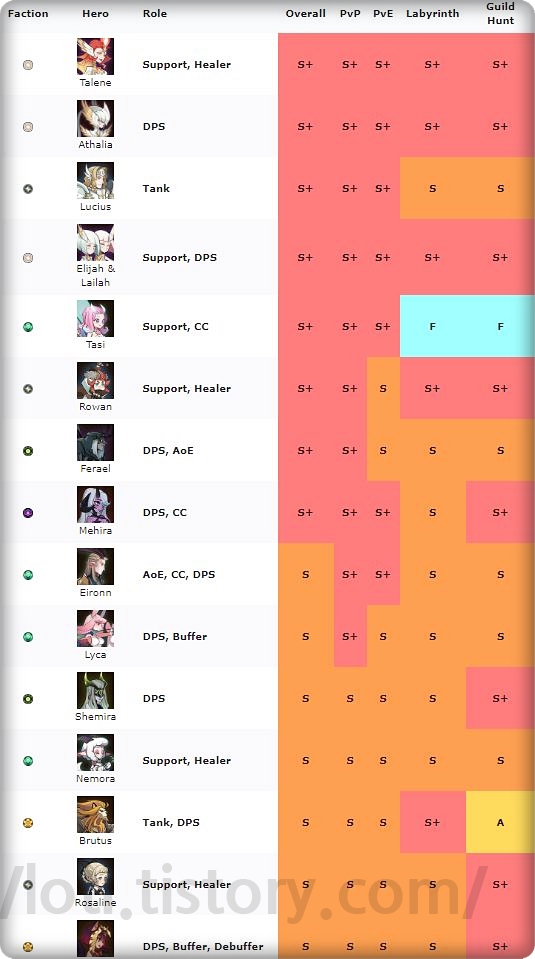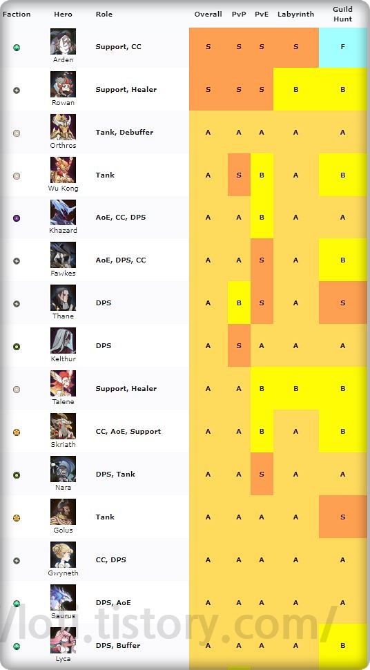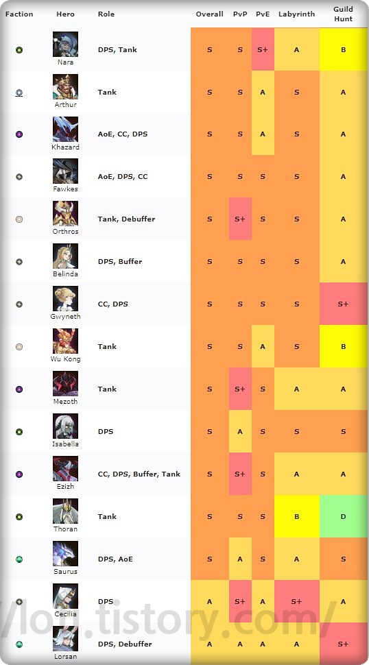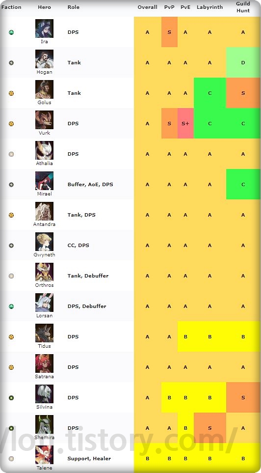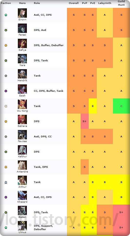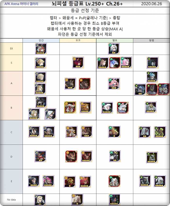 afk아레나 마이너 갤러리에서 한 유저가 최근에 작성한 글로, 국내 기준에서 좋은 영웅들을 다른 유저들과 상의해가면서 올렸다고 합니다. 챕터, 왜꿈세, PVP, 종탑 순으로 많이 기용되는 영웅들 위주로 티어를 매겼으며 해외 등급표와는 다른게 너무 고평가 되거나, 너무 저평가되는 영웅들도 있어서 따로 분류를 했다고 합니다. 이걸 참고하는 것이 더 신뢰도가 있어 보이네요.