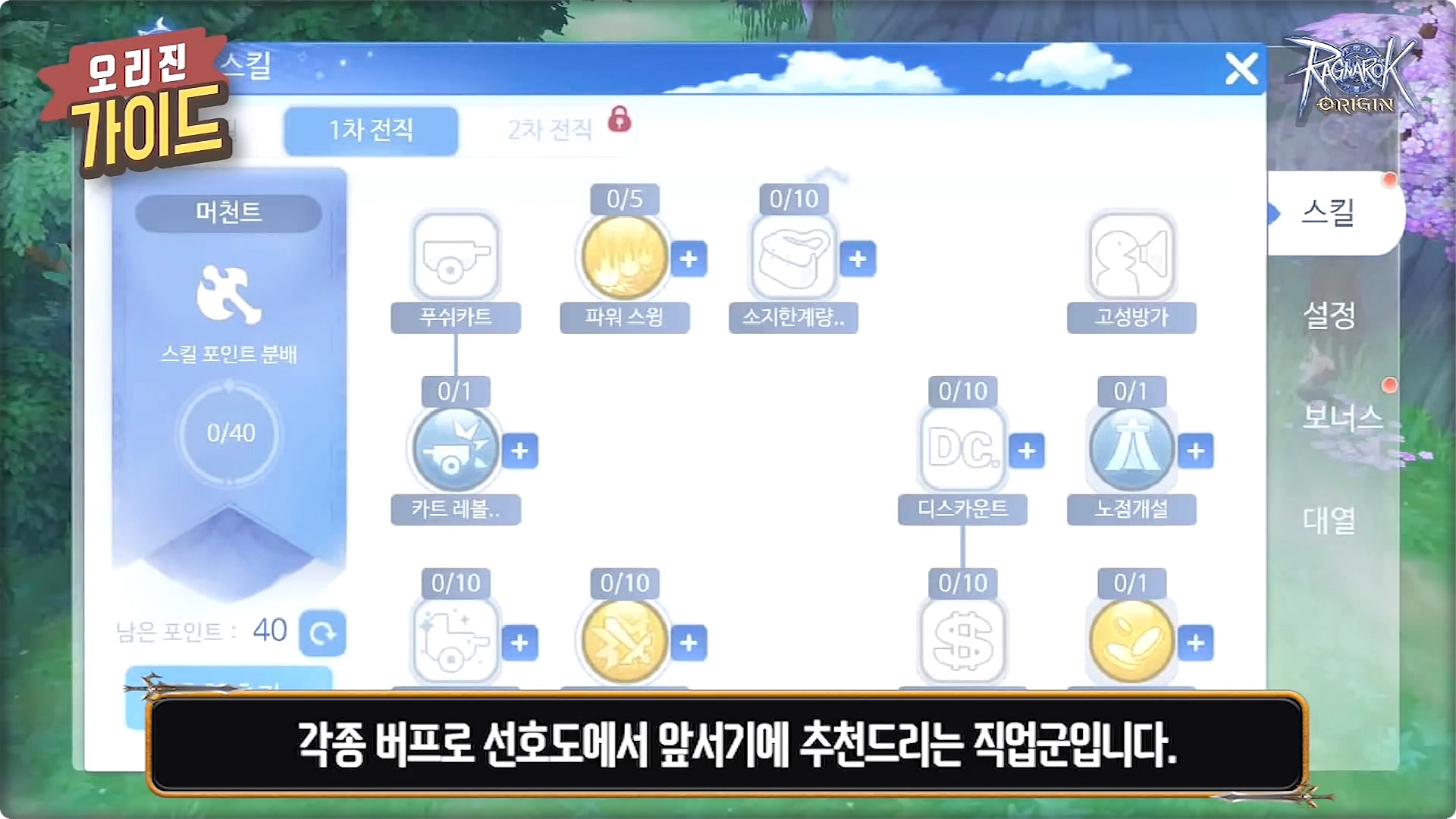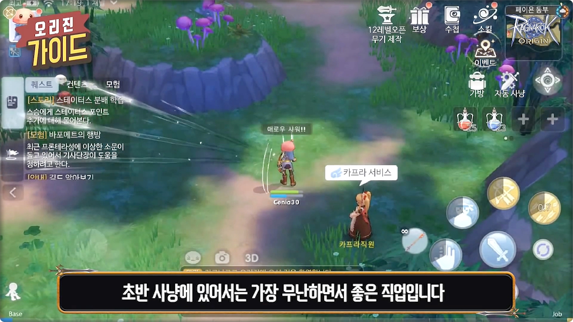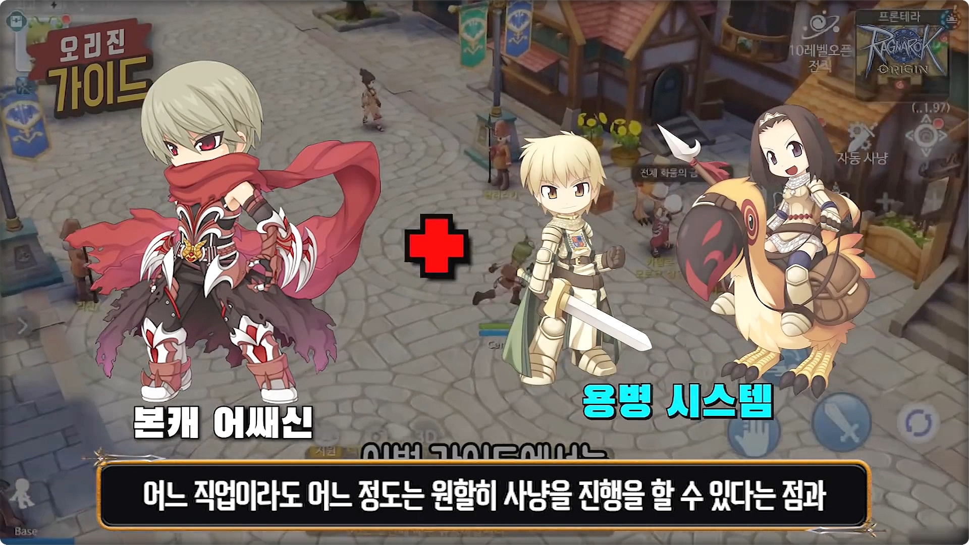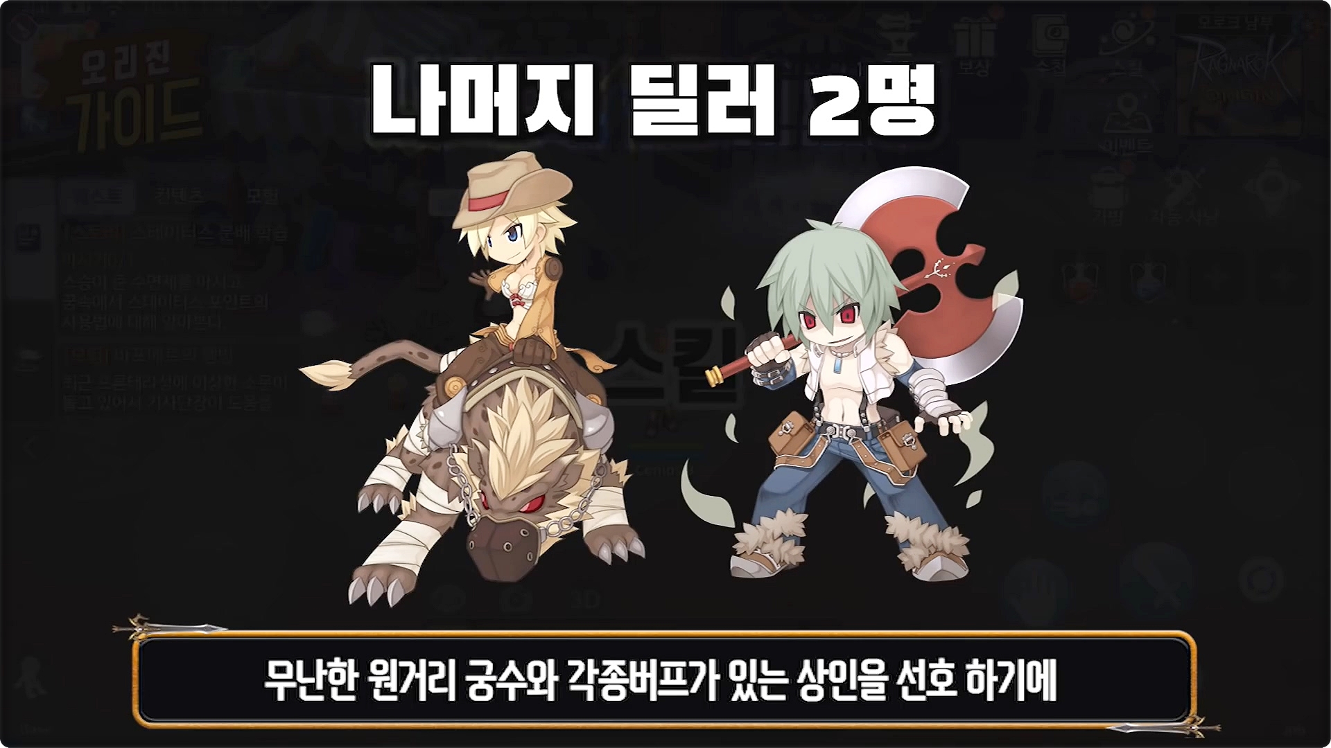 일단 직업추천을 하기전에 왜 이 직업이 좋은지 알기 위해서는 알아야 하는 시스템이 두 가지가 있는데요. 첫 번째로는 바로 용병 시스템입니다. 라그나로크 오리진에는 용병 시스템이라는 것이 있는데 이게 다른 게임의 동료나 펫 이상으로 강력한 전투력을 보여주기 때문에 직업 전투력이 낮은 캐릭터라도 용병을 통해서 레벨링을 할 수가 있습니다. 그렇기 때문에 기존에 솔로 플레이가 어려운 캐릭터들도 충분히 육성이 가능하고, 그래서 직업은 솔로보다는 파티 플레이에 도움이 되는 직업을 더 선호를 합니다.