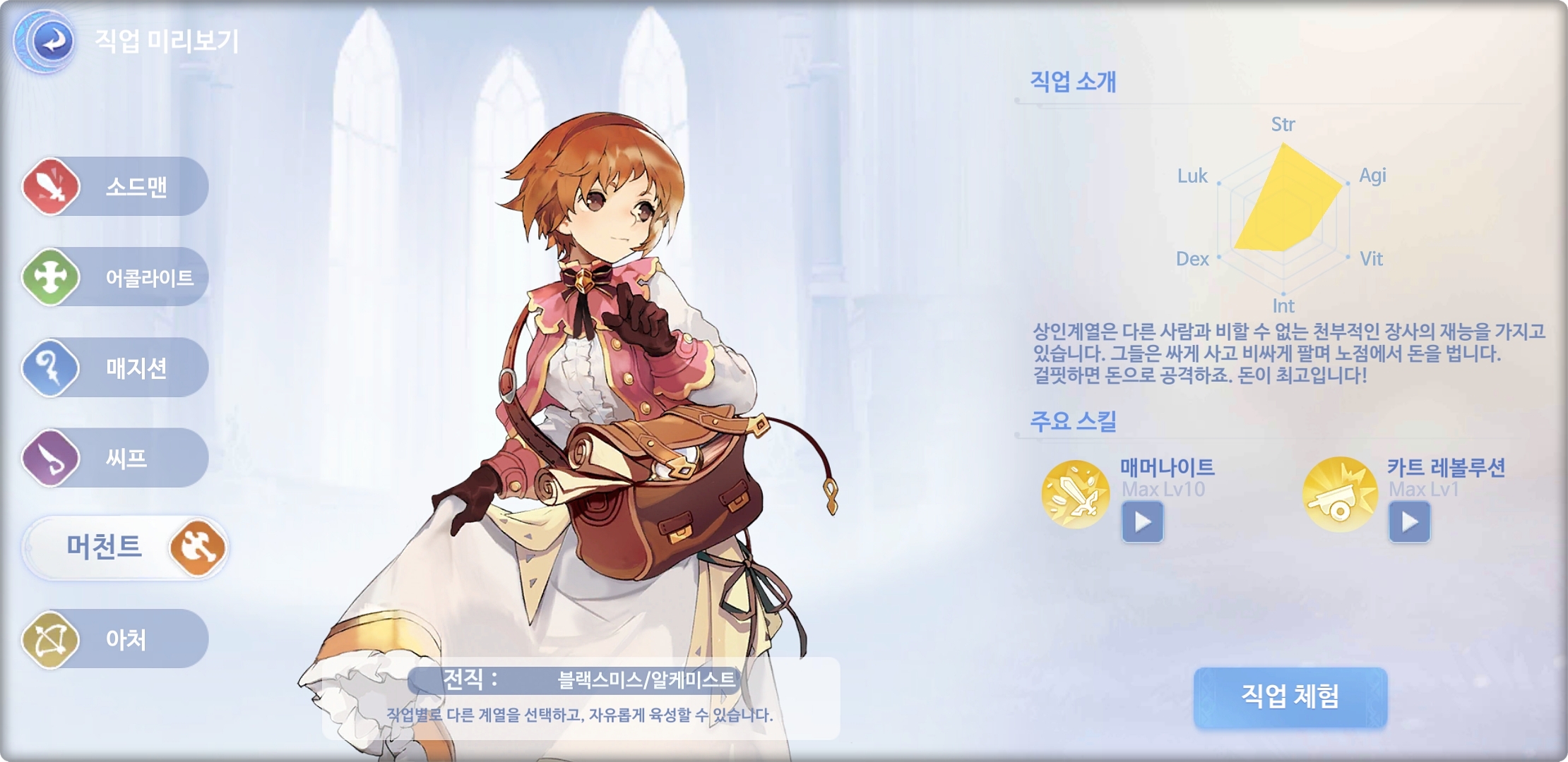 또 스킬트리에 따라서 스킬 딜러 스타일의 상인, 평타 스타일의 상인, 컨텐츠용 상인 등 다양한 스타일로 직업을 육성할 수 있습니다. 또 각종 버프로 어쌔신보다 유틸성이 좋기 때문에 딜러 직업군 중에서 선호도가 상당히 높은 직업입니다. 단점으로는 스킬에 골드를 사용한다던가 하는 단점이 있고, PVP에서 좀 약하다는 단점이 있습니다. PVE위주로 조용히 즐기고 싶은 유저들에게 추천을 하며, 무과금보다는 과금 유저가 힘을 쓰기에 좋지만 그렇다고 무과금이 나쁜 직업은 아닙니다.