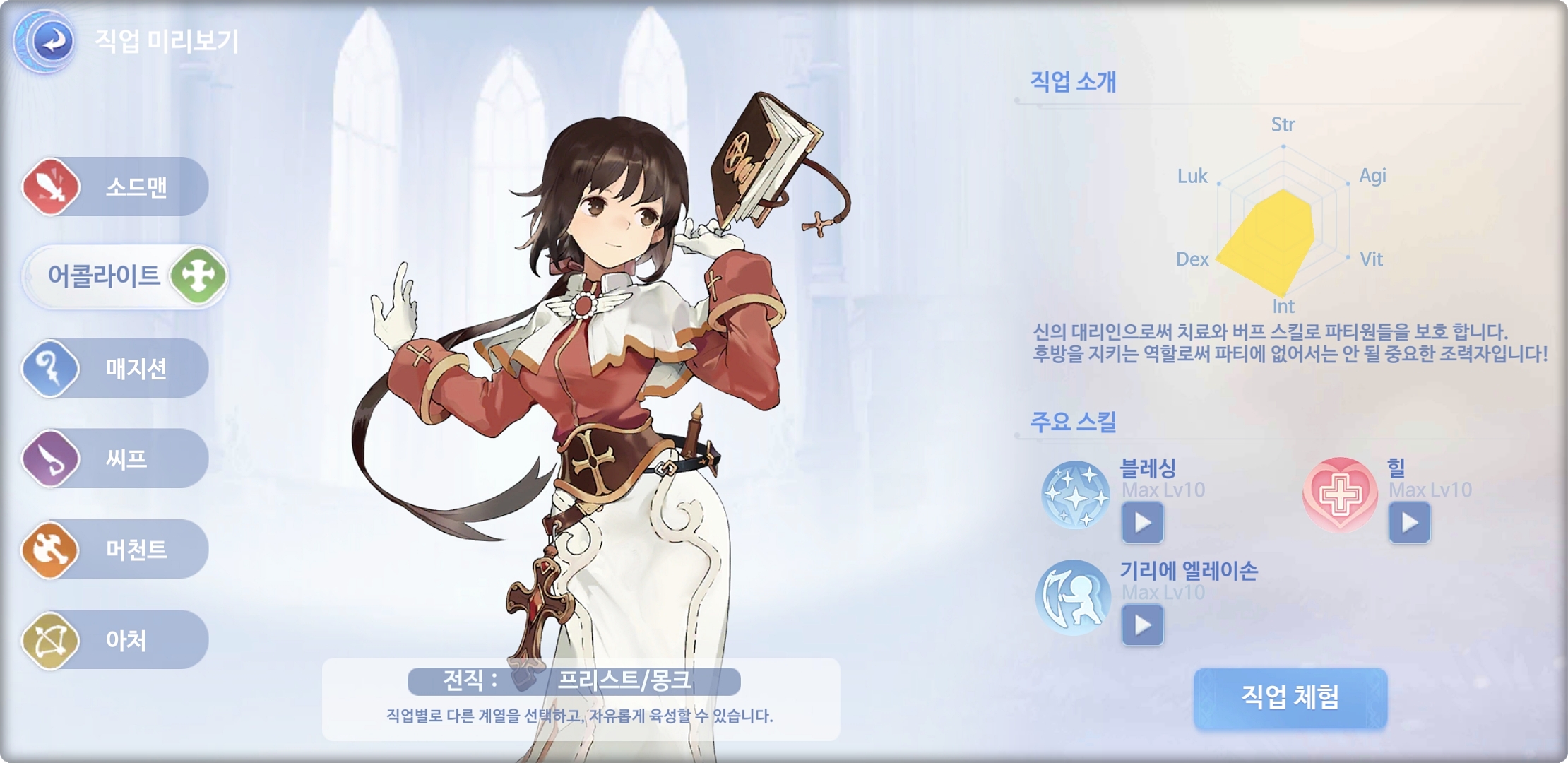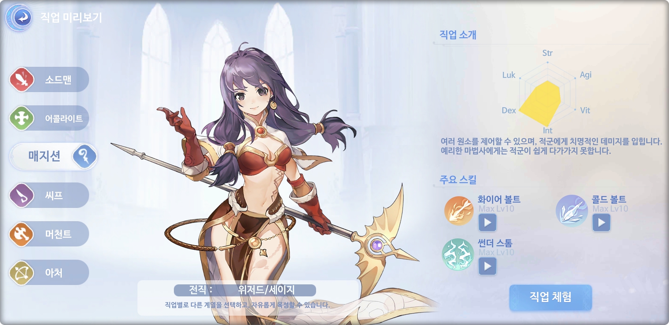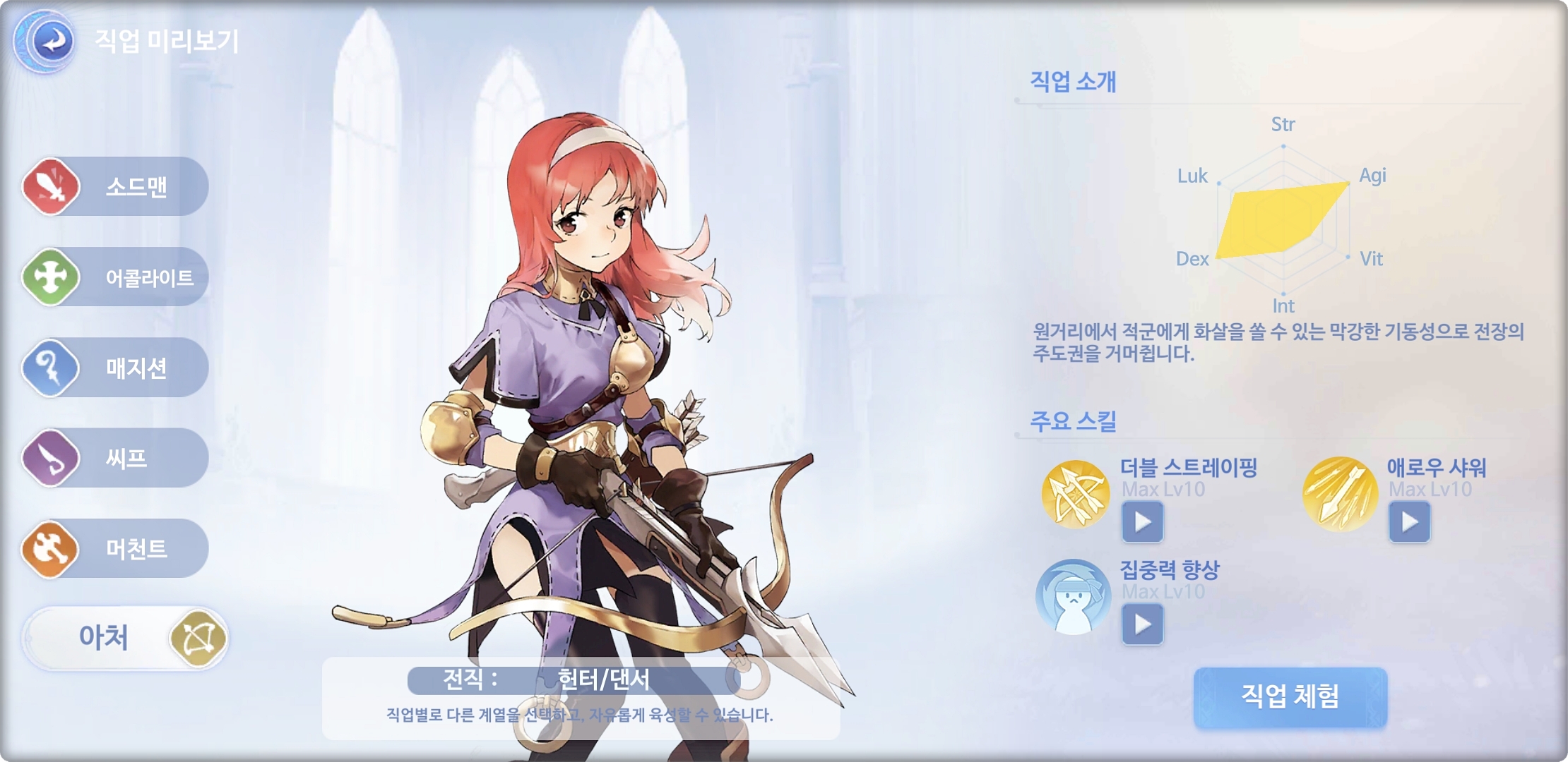 다만 1차전직까지는 상당히 답답한 구석이 있는데 스킬을 쓰는데 일정 시간의 캐스팅 시간이 필요하기 때문에 초반 사냥이 상당히 답답한 편입니다. 하지만 용병이 들어오고 성장함에 따라 이 답답함은 많이 줄어드는 편입니다. 궁수보다 초반 육성이 답답하기 때문에 궁수보다는 아래 추천을 드리는 직업입니다.