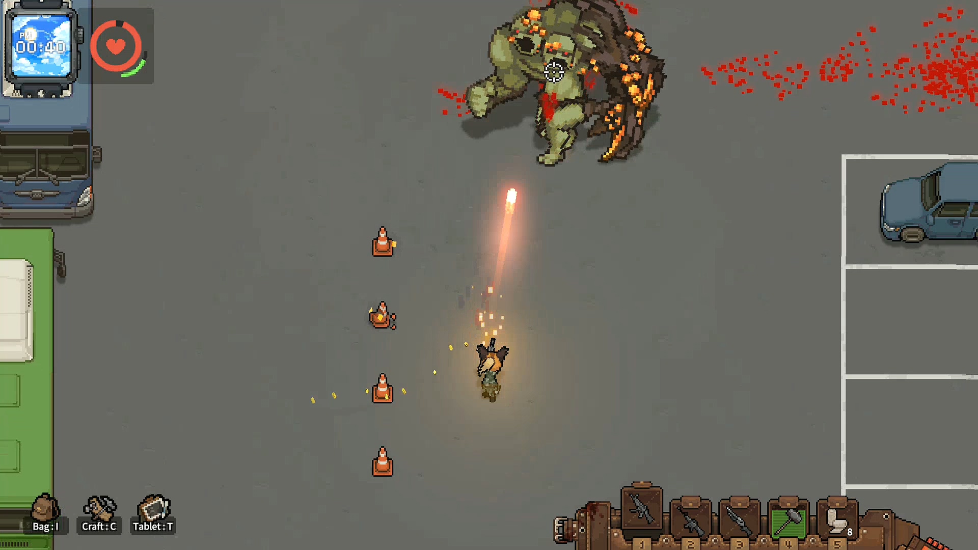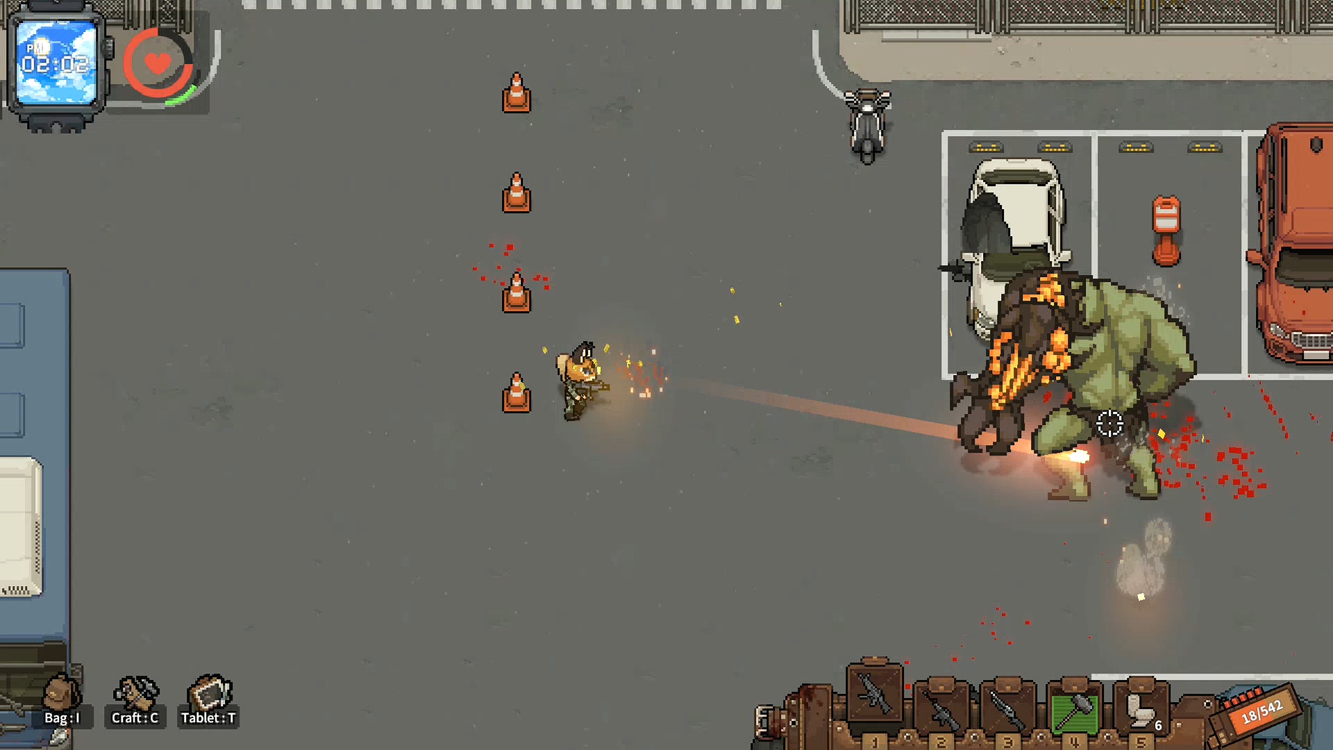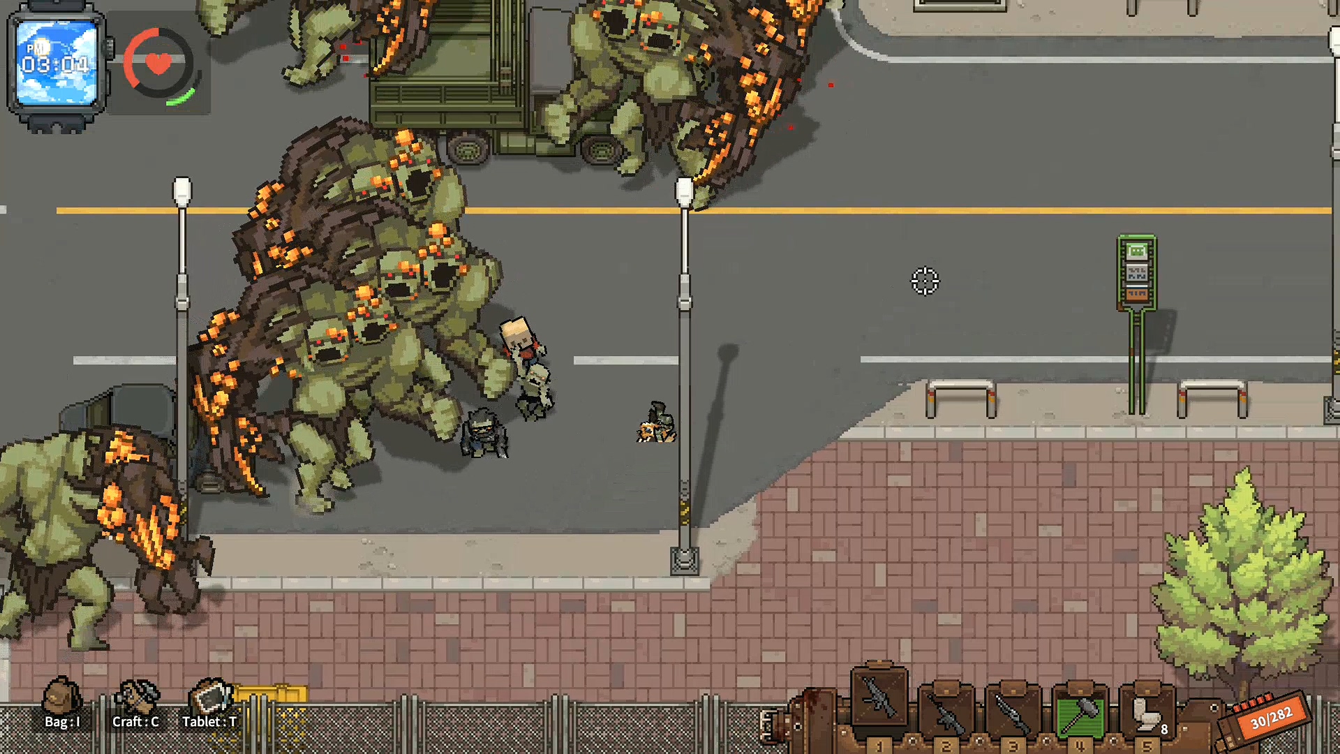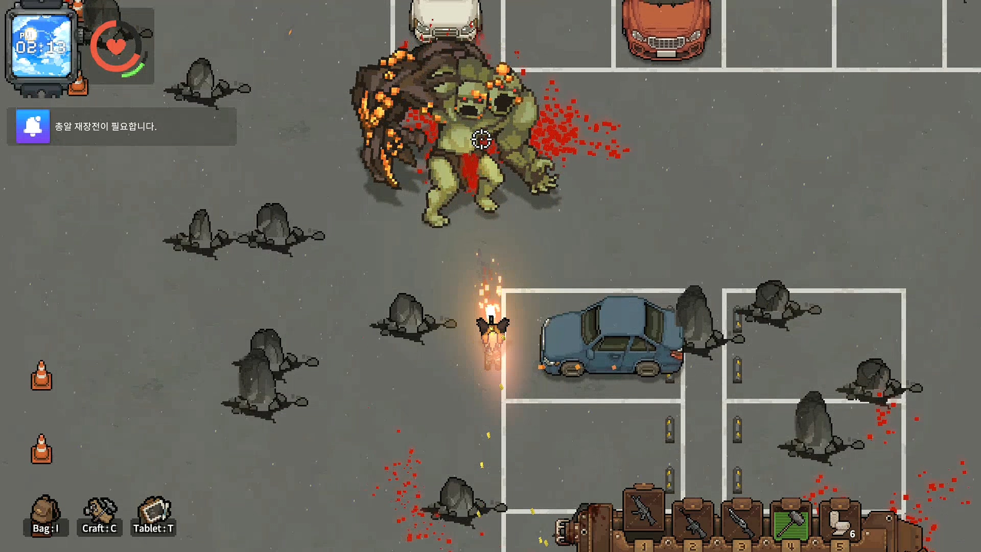 까기만 했으니 좋은점을 말해보라면 전투 요소가 재미있습니다. 이 부분에서 많은 가능성을 봤는데 자폭 좀비와 캐릭터의 보는 방향, 그리고 이동 방법 시스템이 독특해 무빙 하는 재미와 치고 빠지는 재미가 쏠쏠합니다. 설명을 하자면 이 게임은 마우스 방향으로 캐릭터가 바라보는데 바라보는 방향의 반대방향으로 이동하면 백스텝을 하고 이동속도가 줄어듭니다. 반대로 바라보는 방향으로 이동하면 이동속도가 증가하기 때문에 백스텝으로 공격하면서 좀비를 정리하다, 좀비가 붙으면 반대 방향으로 바로 방향 전환을 해서 뛰어간다던가, 자폭 좀비의 자폭 범위에서 순간적으로 벗어나기 위해서 구르기를 타이밍에 맞게 한다던가 등 컨트롤하는 재미가 있습니다.