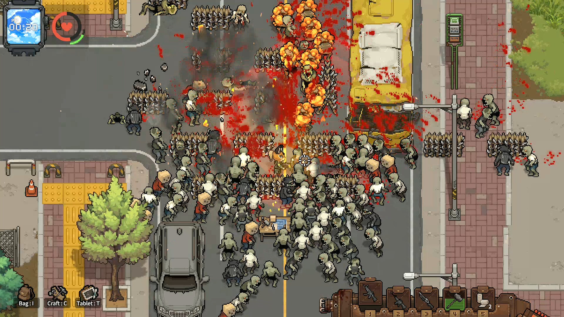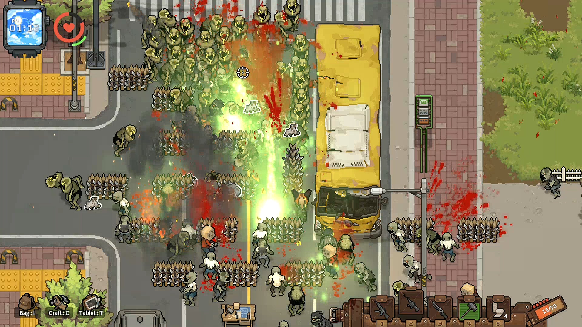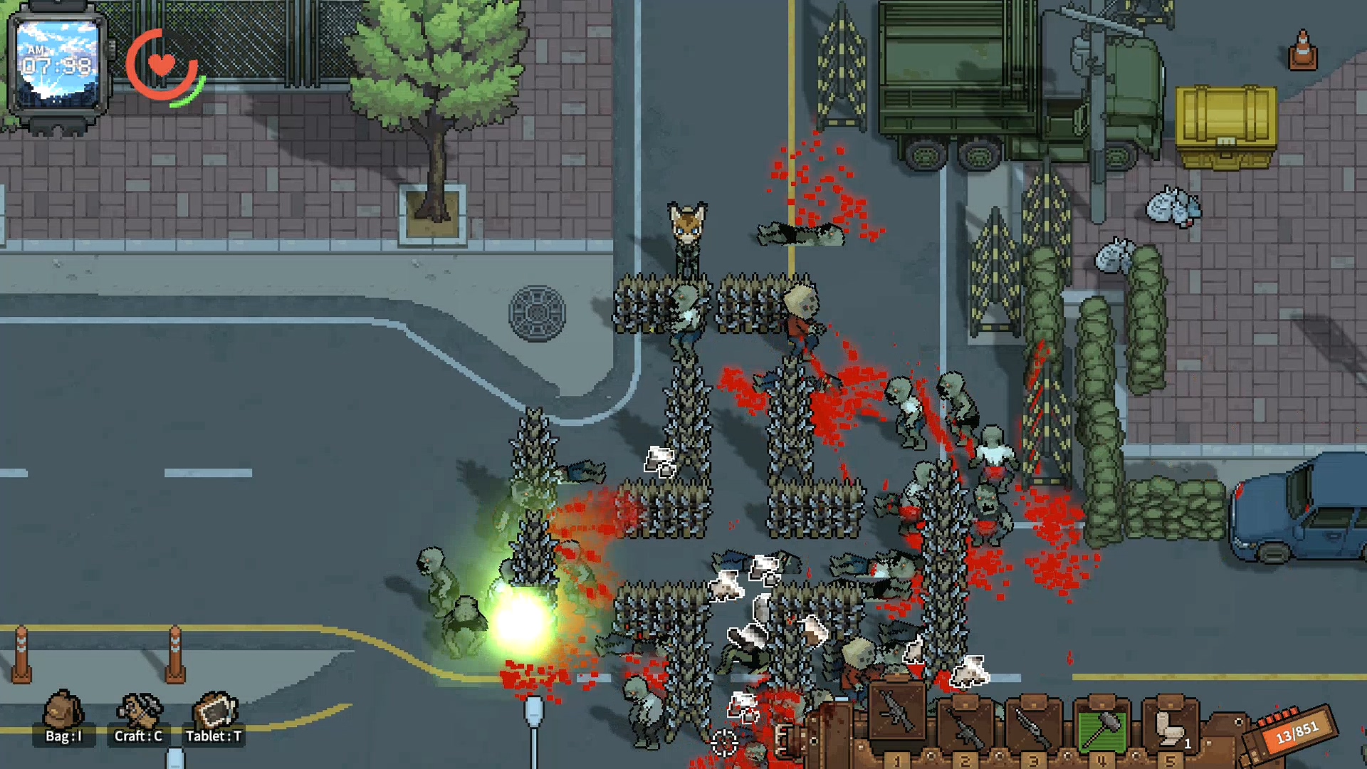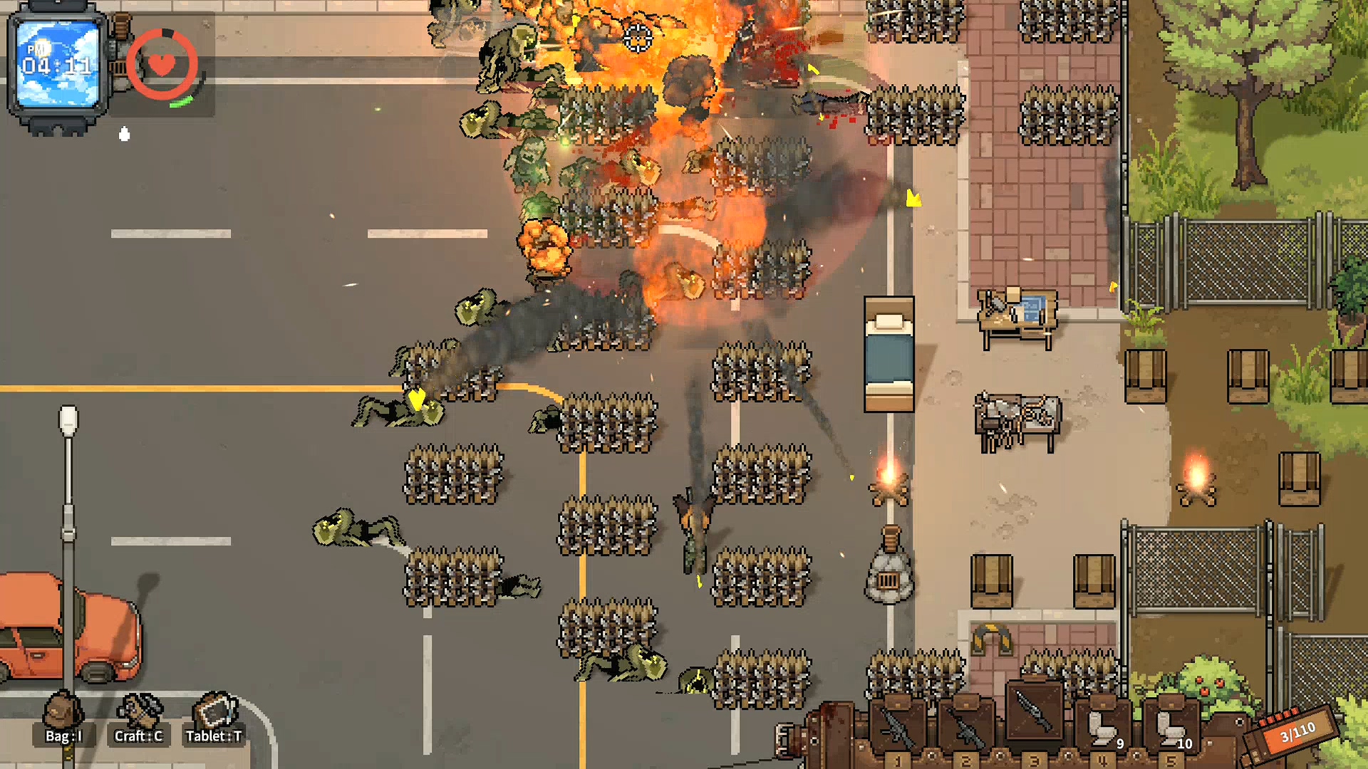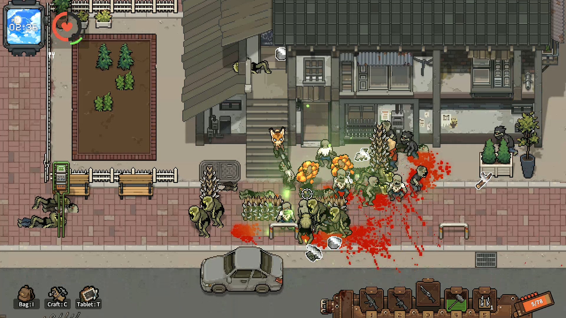 까기만 했으니 좋은점을 말해보라면 전투 요소가 재미있습니다. 이 부분에서 많은 가능성을 봤는데 자폭 좀비와 캐릭터의 보는 방향, 그리고 이동 방법 시스템이 독특해 무빙 하는 재미와 치고 빠지는 재미가 쏠쏠합니다. 설명을 하자면 이 게임은 마우스 방향으로 캐릭터가 바라보는데 바라보는 방향의 반대방향으로 이동하면 백스텝을 하고 이동속도가 줄어듭니다. 반대로 바라보는 방향으로 이동하면 이동속도가 증가하기 때문에 백스텝으로 공격하면서 좀비를 정리하다, 좀비가 붙으면 반대 방향으로 바로 방향 전환을 해서 뛰어간다던가, 자폭 좀비의 자폭 범위에서 순간적으로 벗어나기 위해서 구르기를 타이밍에 맞게 한다던가 등 컨트롤하는 재미가 있습니다.