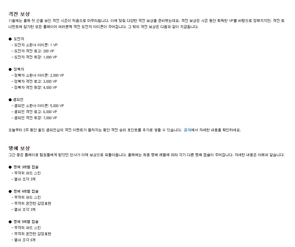 그리고 올해는 명예 보상과 격전 보상이 지급이 되는데요. 명예 보상부터 무작위 와드 스킨, 열쇠 조각, 무작위 온전한 감정표현을 받을수가있습니다. 명예 레벨에 따라 보상은 조금더 늘어납니다. 그리고 격전 보상의 경우 소환사 아이콘, 격전 로고, 격전 휘장을 등급별로 받을 수가 있습니다.