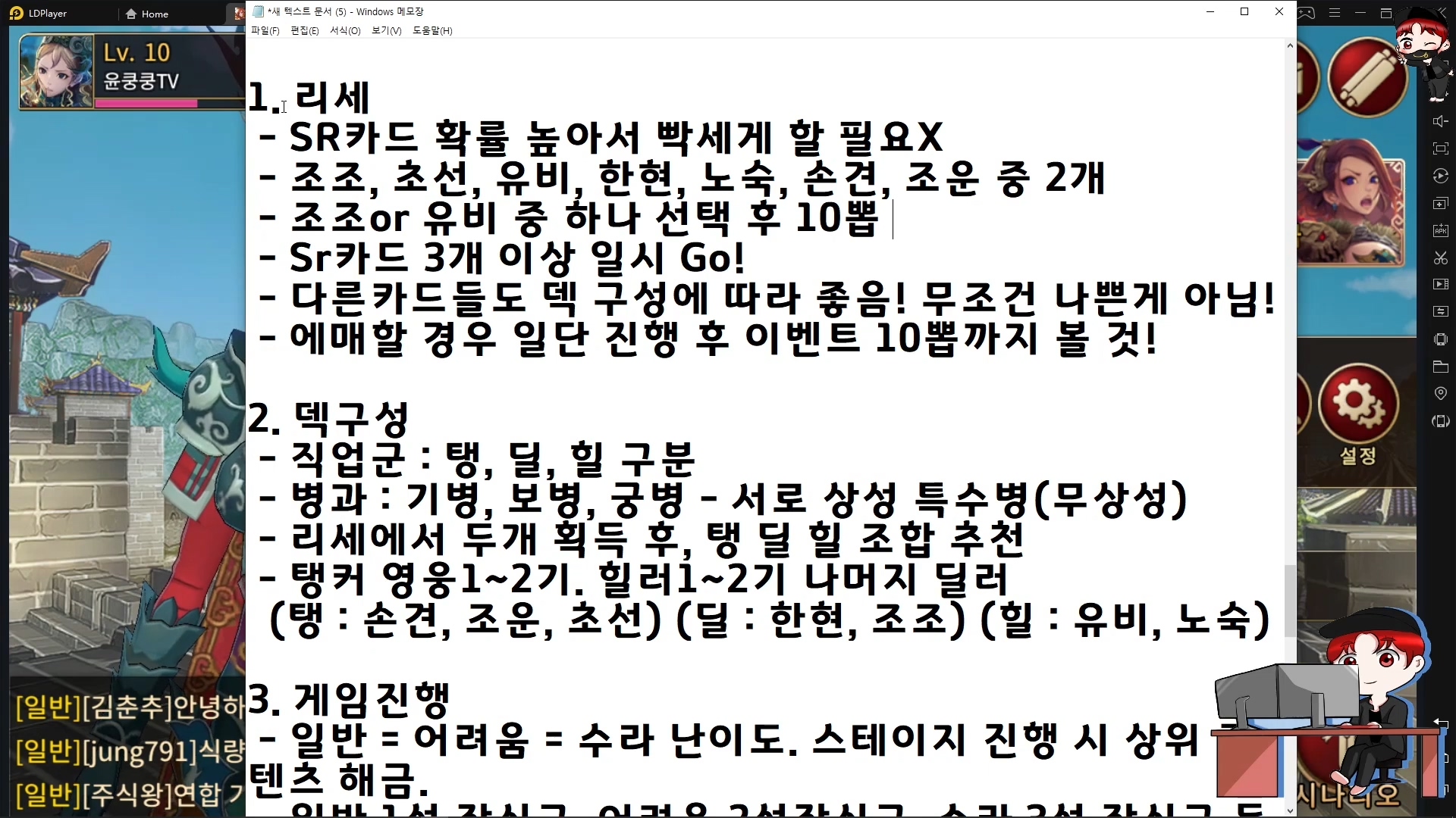 실제 게임을 플레이하는 윤쿵쿵님의 영상을 봐도 조조, 초선, 유비, 한현, 노숙, 손견, 조운 중 2개 이상 나오면 바로 하면 되며 선별소환에서 조조 or 유비를 추천을 하는데 조조보다는 힐러인 유비를 가져가는 것이 무과금 유저들에게는 좀 더 편하다고 합니다. 만약 유비가 없다면 노숙을 힐러로 사용하는 것이 좋다고 합니다. 그리고 SR카드가 3개 이상일 시에도 시작하면 되며, 무과금도 어느 정도 영웅 확보가 쉽기 때문에 너무 절실하게 리세를 할 필요가 없다고 하네요.