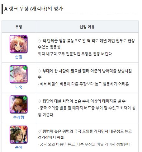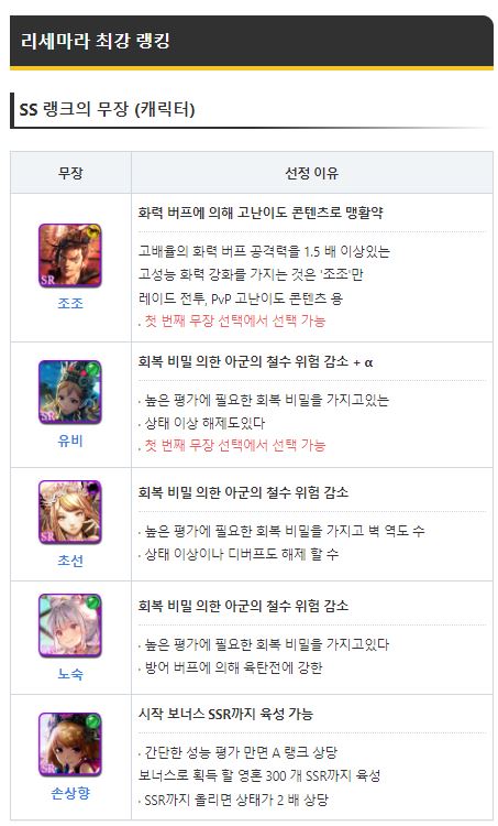 리세마라의 경우 일섭 기준 등급표이며 한국판과 거이 동일하다고 보시면 좋습니다. 조조,유비,초선,노숙,손산향을 추천하며 S등급의 경우 한현, 제갈량, 손견, 그리고 A등급은 조운 정도 생각해두시면 좋습니다.