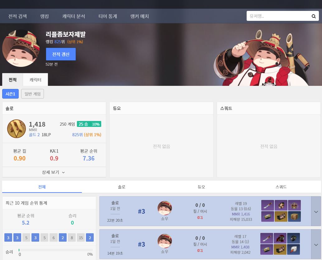 검색을 하게 되면 순위와 티어, 그리고 사용한 템트리 등등 나옵니다. 사실 유저 정보를 볼 때 가장 궁금한 것은 동선인데 아쉽게도 동선은 나오지 않습니다. 그리고 장비 역시 보급품이나 약탈을 통해 바꿀 경우에도 마지막에 사용한 아이템이 나오기 때문에 정확한 정보를 보기는 어렵습니다. 그러니 동선이나 템트리 관련 공략을 보고 싶다면 공략 커뮤니티나 유튜브 영상 등을 찾아보는 것이 좋습니다. 제 닉네임이 리플좀보자제발인 이유도 리플을 보고 배우고 싶어서입니다.