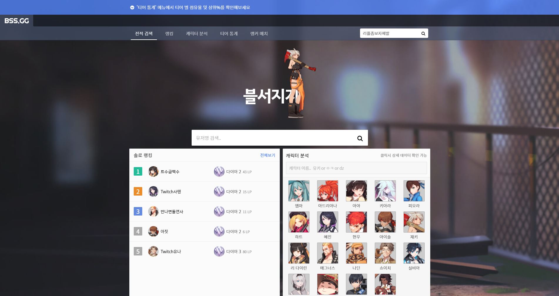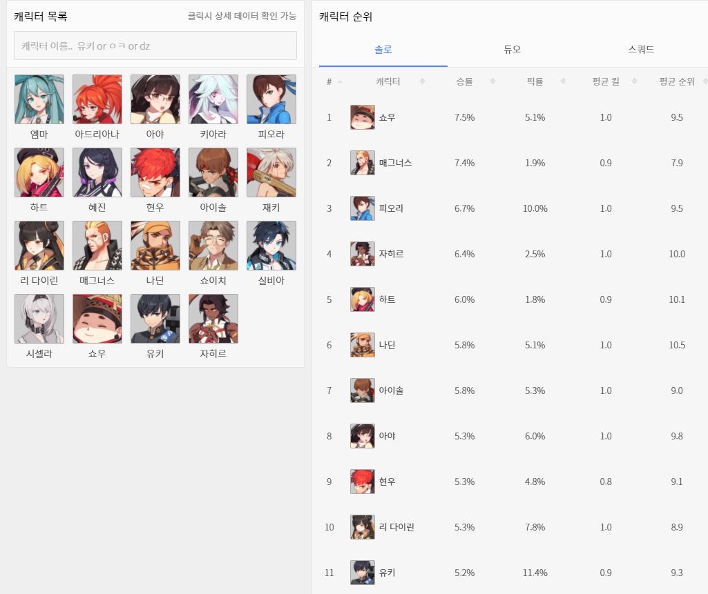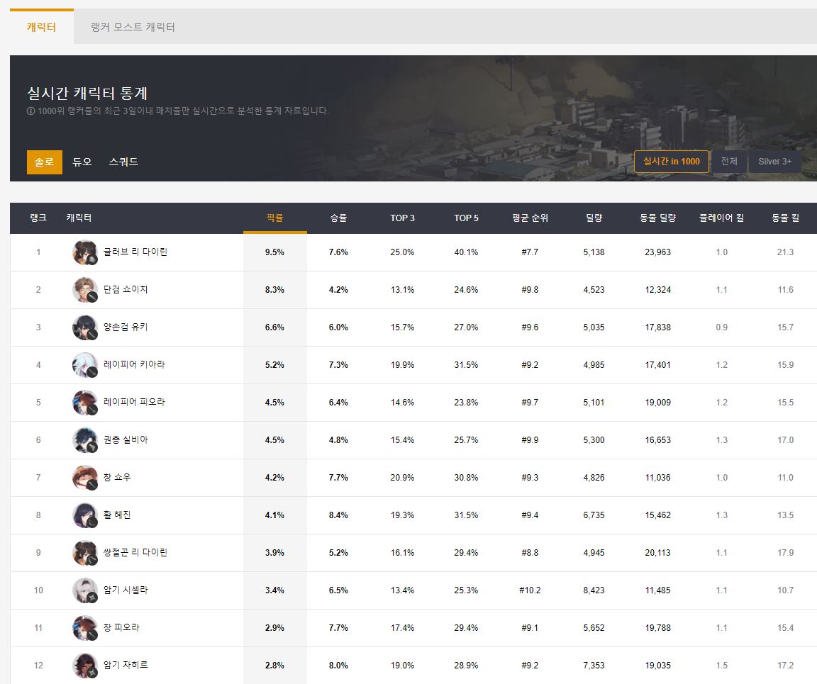 게임을 하면 캐릭터 티어를 많이 보죠. DAK.gg와 BSS.gg는 캐릭터별 통계가 다릅니다. DAK.gg의 경우 캐릭터 + 사용 장비별로 통계를 보여줍니다. 사실상 캐릭터가 같다고하더라도 무기별 승률이 다르기 때문에 저게 정밀한 통계라고 할 수 있습니다. BSS.gg의 경우 캐릭터 통계만 나오는데 이점은 좀 아쉽습니다. 쇼우, 매그너스의 경우 도망만 다니며 순위만 높게 차지하는 경우가 많기 때문에 킬을 많이 해야 티어가 빨리 오르는 블서 특성상 실제 티어와 다를 수 있습니다. 이점은 DAK.gg가 좀 더 정밀해 보입니다. 좀 더 자세한 정보를 보고 싶다면 공식 홈페이지 통계도 좋습니다.