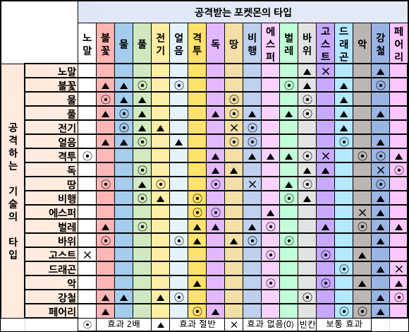 다른 상성표도 준비해봤습니다. 동일한 내용인데 위의 상성표가 보기 불편하시면 다른 상성표로 한번 봐 보시는 것도 어떨까 싶네요. 좀 더 자세한 내용을 쓰고 싶은데 영상을 저장해둔 것이 없어 오늘은 간단하게만 소개해드릴까 합니다. 도움이 되었으면 좋겠고 조만간 포켓몬 즐기고 내용 좀 더 자세하게 소개해드리도록 하겠습니다.