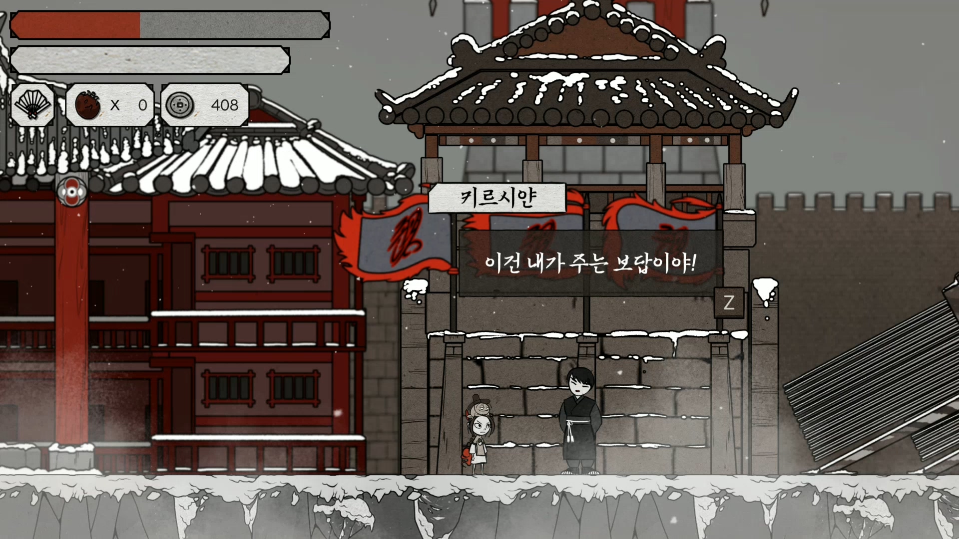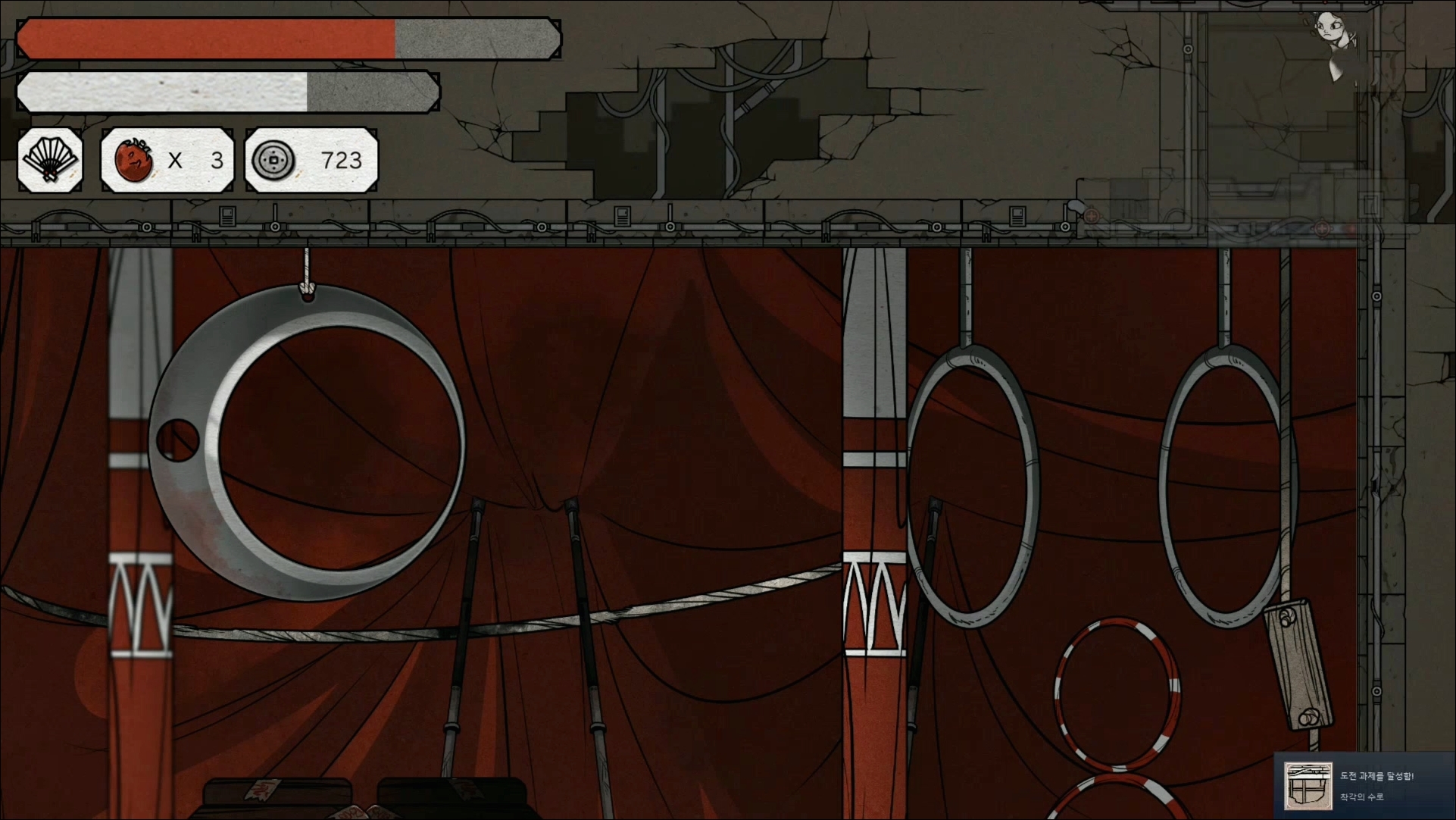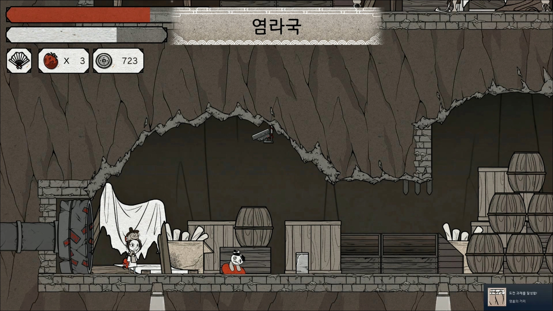 비밀 보스인 유령 각시가 나오는 벽에서 벽을 차고 올라가면 비밀 장소를 찾을 수가 있습니다. 여기서 넘어가면 염라국이 나오는데요.