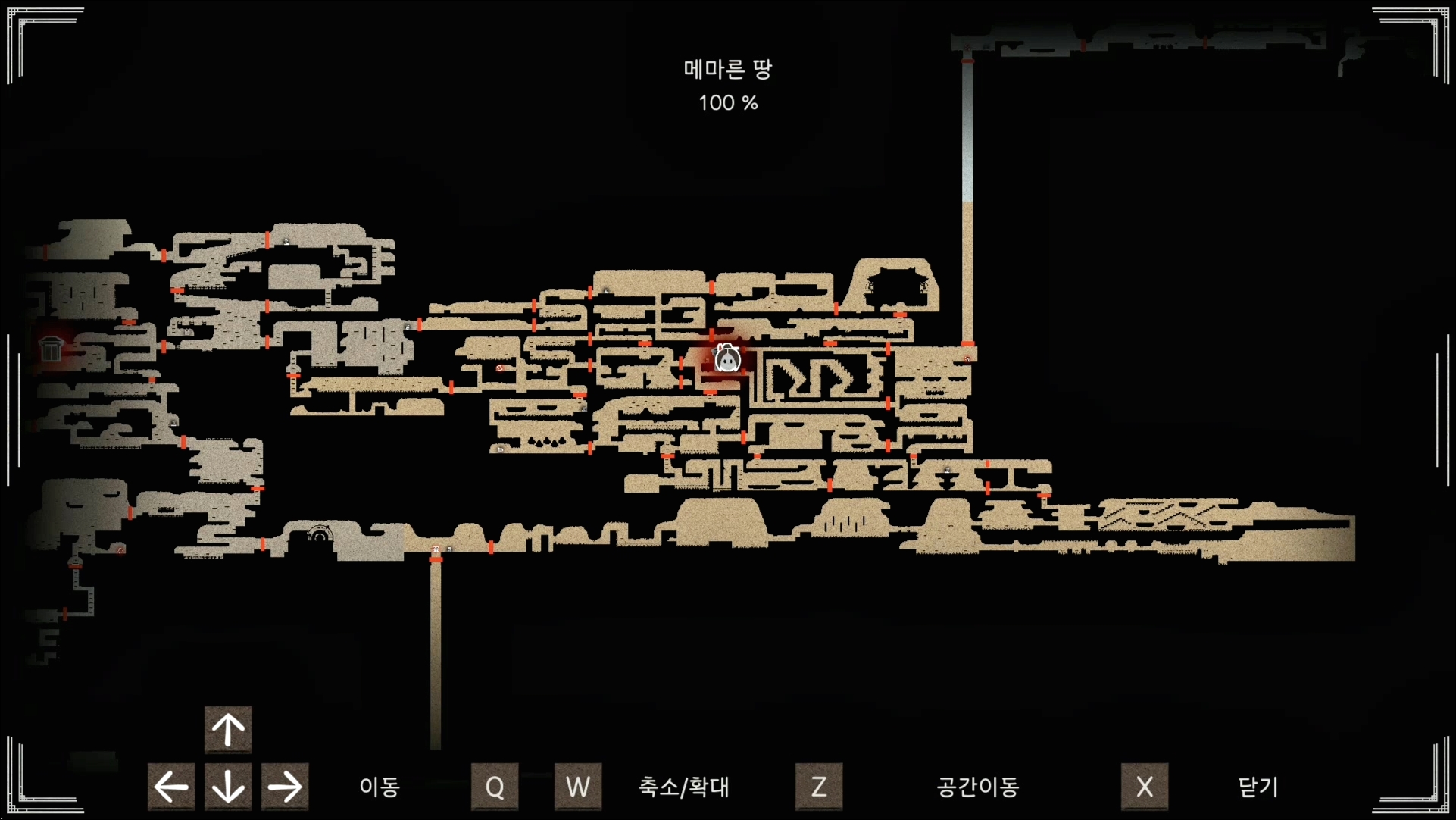 가장 넓은 맵이기 때문에 100%를 채울 때 가장 고통스럽고 크게 숨겨진 루트는 없지만 비밀 길이 은근히 많이 숨겨진 지역입니다. 아래쪽 불가사리가 나오는 구간보다는 위쪽 구간에 숨겨진 지역이 많고, 바위산에서만 진입 가능한 지역도 있기 때문에 메마른 땅에서만 100%를 채우려고 하면 안 됩니다. 그래서 제가 가장 고통받은 구간이고요. 또 숨겨진 보스도 바위산에서 진입을 해야 찾을 수 있습니다.
