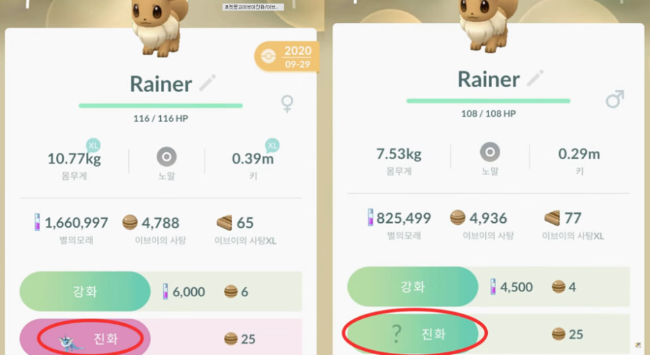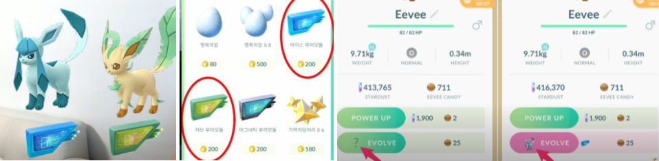 진화방법은 확정 진화인 이름 진화방법과 각 이브이마다의 진화방법이 있습니다. 이름 진화는 게임 중에 단 한 번만 사용할 수 있는 방법으로 꼭 필요하실 때 사용하는 것이 좋습니다. 특히 진화가 어려운 이브이의 경우에 사용하는 것을 추천을 드립니다.