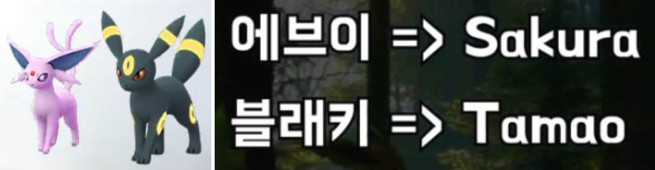 다음 에브이 블랙키의 경우 파트너 포켓몬으로 변경을 한 후 5KM씩 2번 10KM를 채운 뒤에 진화를 하면 되는데요. 낮에 진화하면 에브이, 밤에 진화하면 블래키가 됩니다. 이름을 통한 확정 진화는 에브이 => Sakura, 블래키 =>Tamao로 변경하신 후 진화를 하시면 됩니다.