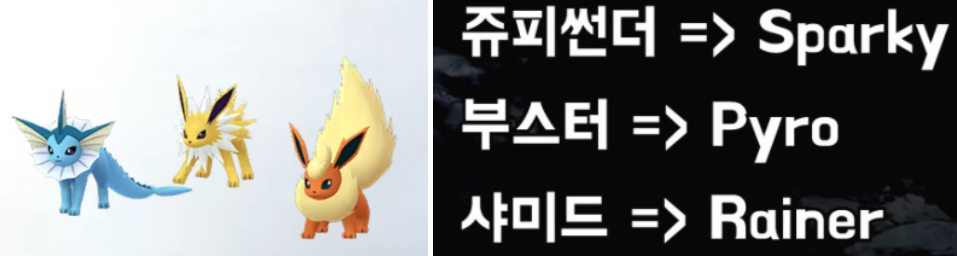 쥬피썬더, 부스터, 샤미드의 이름 진화는 각각 Sparky, Pyro, Rainer입니다. 이미지 참고하시면 편할 것 같고요. 쥬피썬더, 부스터, 샤미드의 경우 이름 진화가 아닌 일반적인 진화를 위해서는 이브이의 사탕 25개를 필요로 하며 3개의 포켓몬은 선택해서 진화할 수 있는 것이 아닌 진화를 할 때 3개 중에서 랜덤으로 선택되는 방식이라 어느 정도 운이 따라줘야 하는 포켓몬입니다. 그러니 이름 진화를 잘 사용하는 것이 좋습니다.